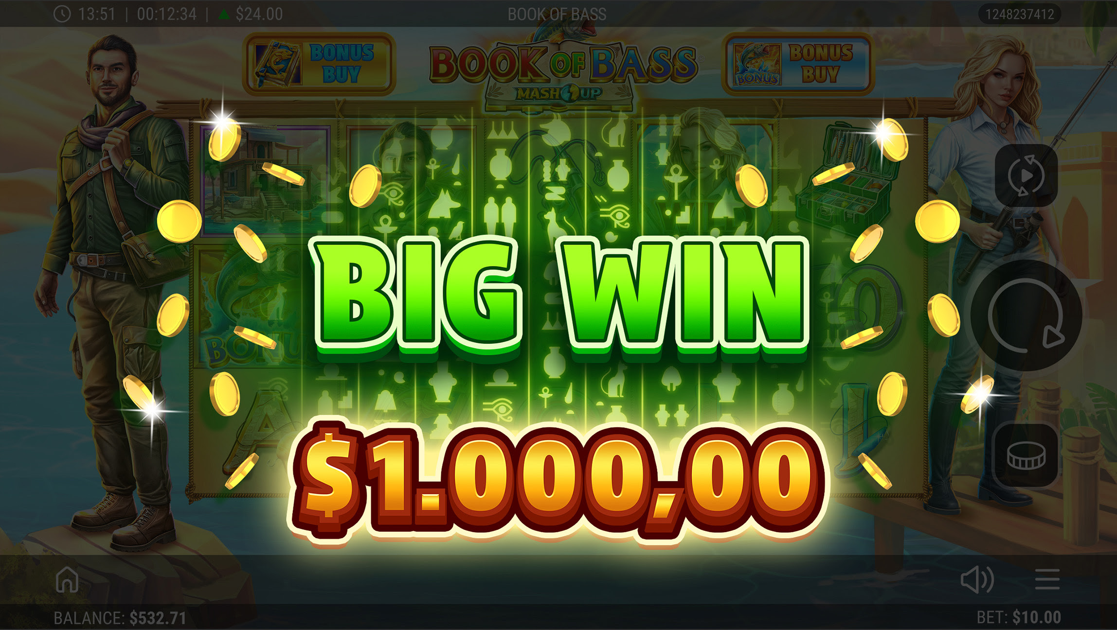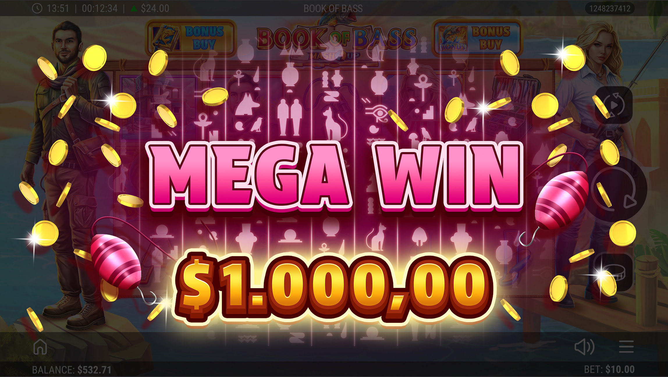 Step into a world where ancient Egyptian mystique meets the thrill of fishing with Book of Bass! Picture yourself unearthing secrets from a forgotten time, as the reels come alive with the promise of adventure. Land 3 or more Book scatters and immerse yourself in Free Spins, where a symbol transforms into a golden beacon of fortune. Watch as the Fisherwoman graces the game, reeling in shimmering cash rewards. Trigger the Fishing Bonus Round with 3+ Logo Scatters and marvel at the Fisherman’s enchantment—he gathers fish values, awards extra spins, and amplifies multipliers. And if luck is on your side, the magical Can of Worms feature will turn simple worms into sparkling fish prizes. Are you ready to cast your line and uncover the hidden treasures of Book of Bass?
