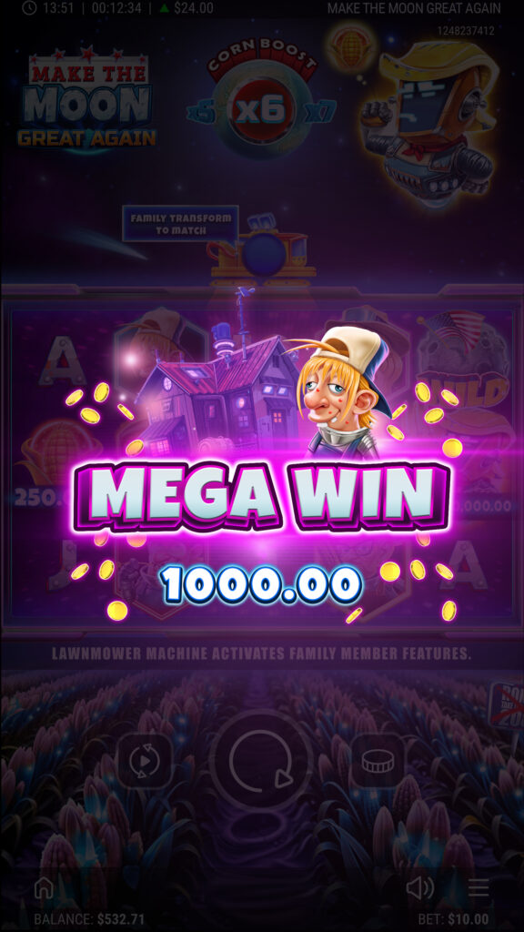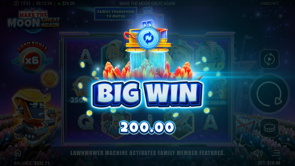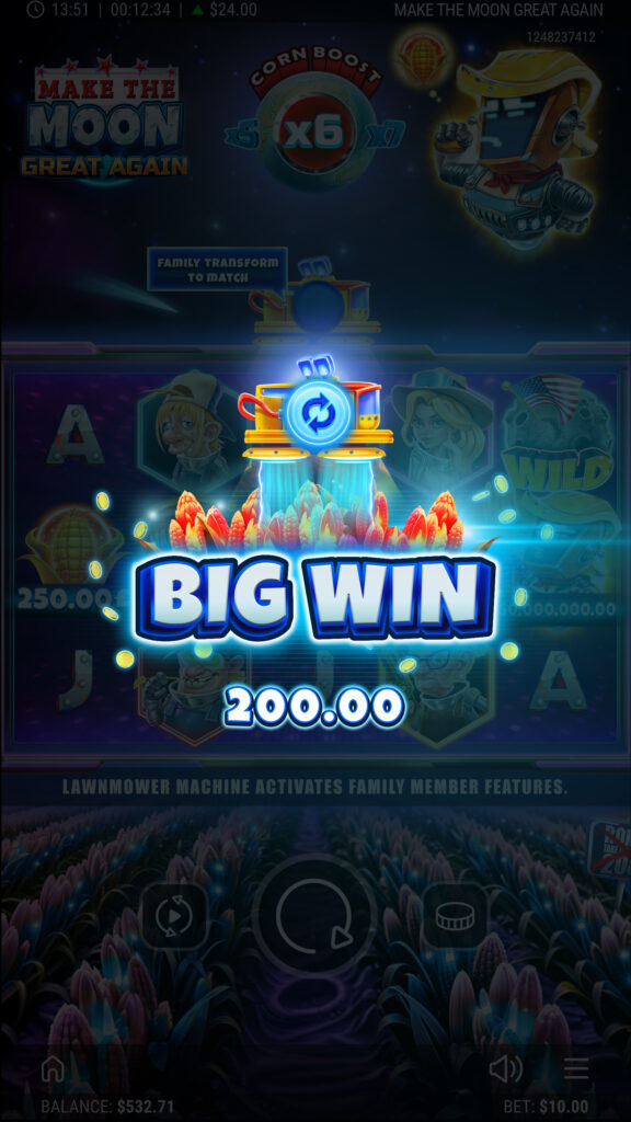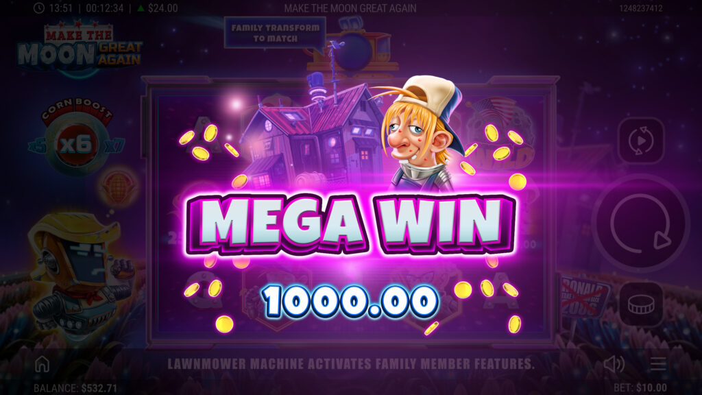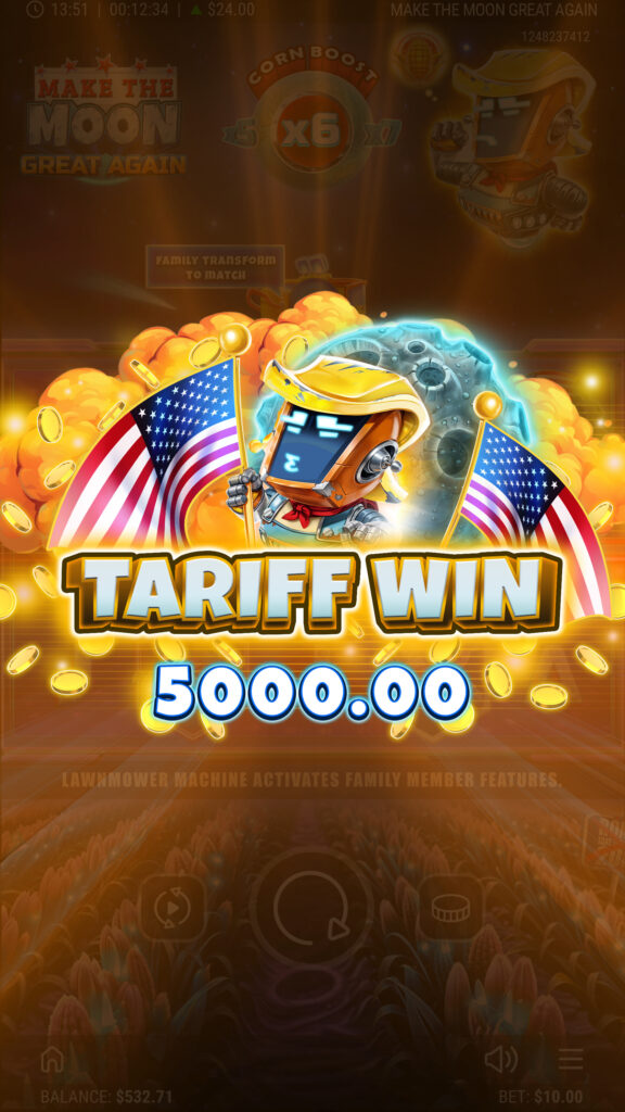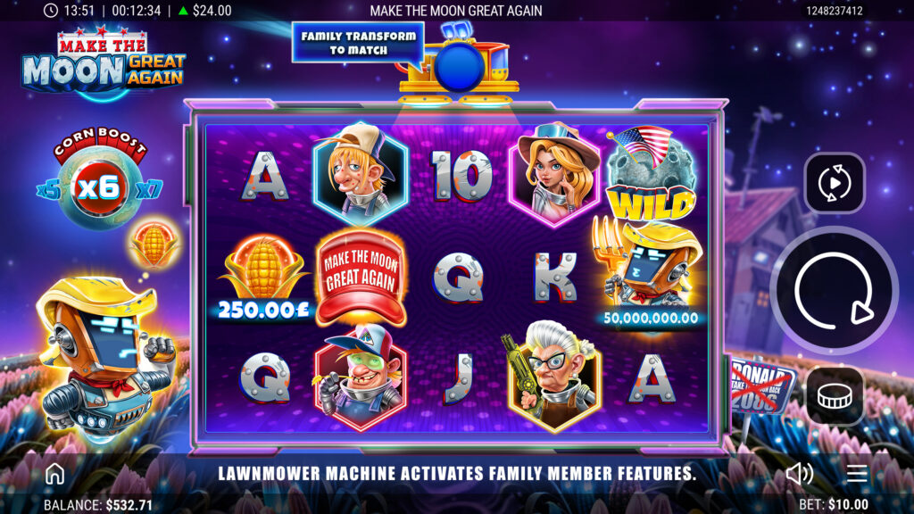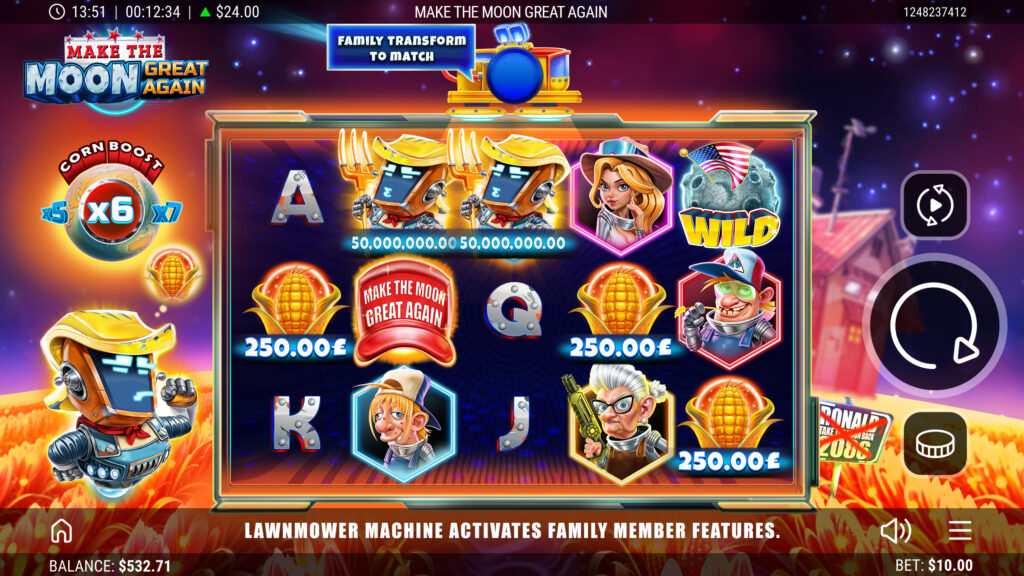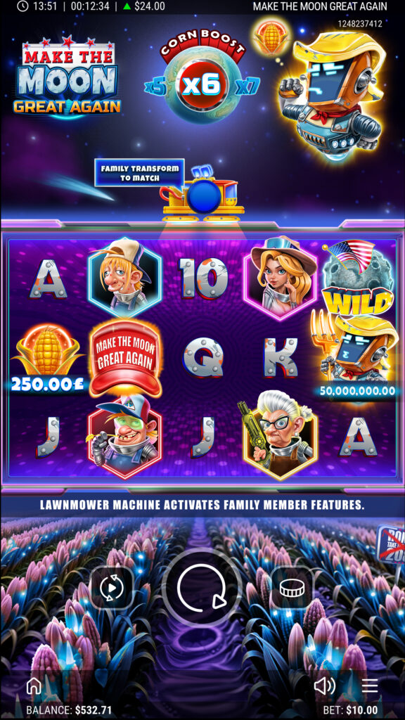 The Harvesters have fled Earth to farm Plasma Crops on the Moon, while poor Ronald the robot battles to keep his battered LawnMower from falling apart. In this offbeat 5×3 slot, the LawnMower sparks into action across the reels, transforming symbols, spawning Wilds and unleashing multipliers. When the Moon trembles, Lunar Wild Bursts scatter up to six Wilds in an instant, reshaping the grid for stellar wins. A well-timed Magnetic Mega Boost can supercharge payouts up to ×15, while Lunar Free Spins launch players into orbit with re-triggers that stack higher and higher. From rickety machines to cosmic jackpots, every spin is packed with suspense, humour and lunar-sized rewards!