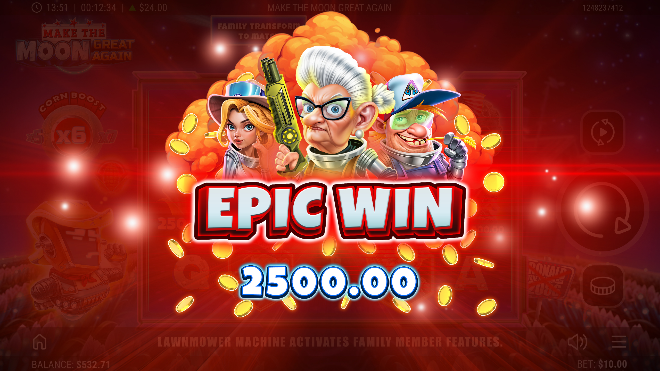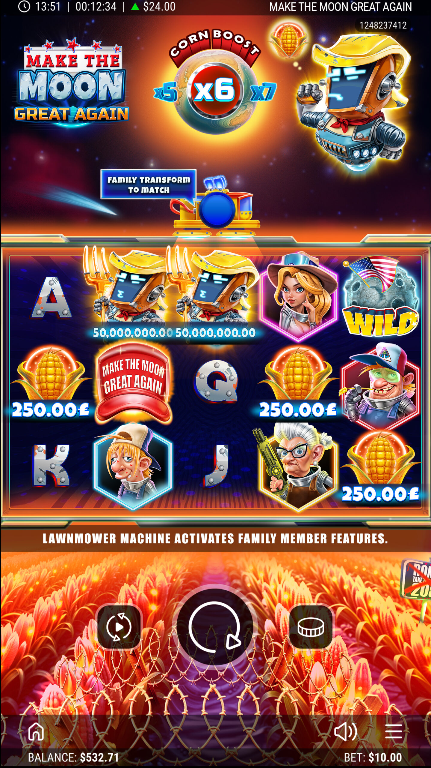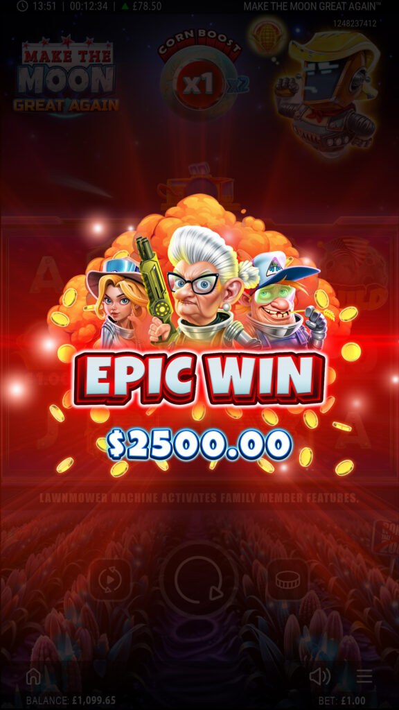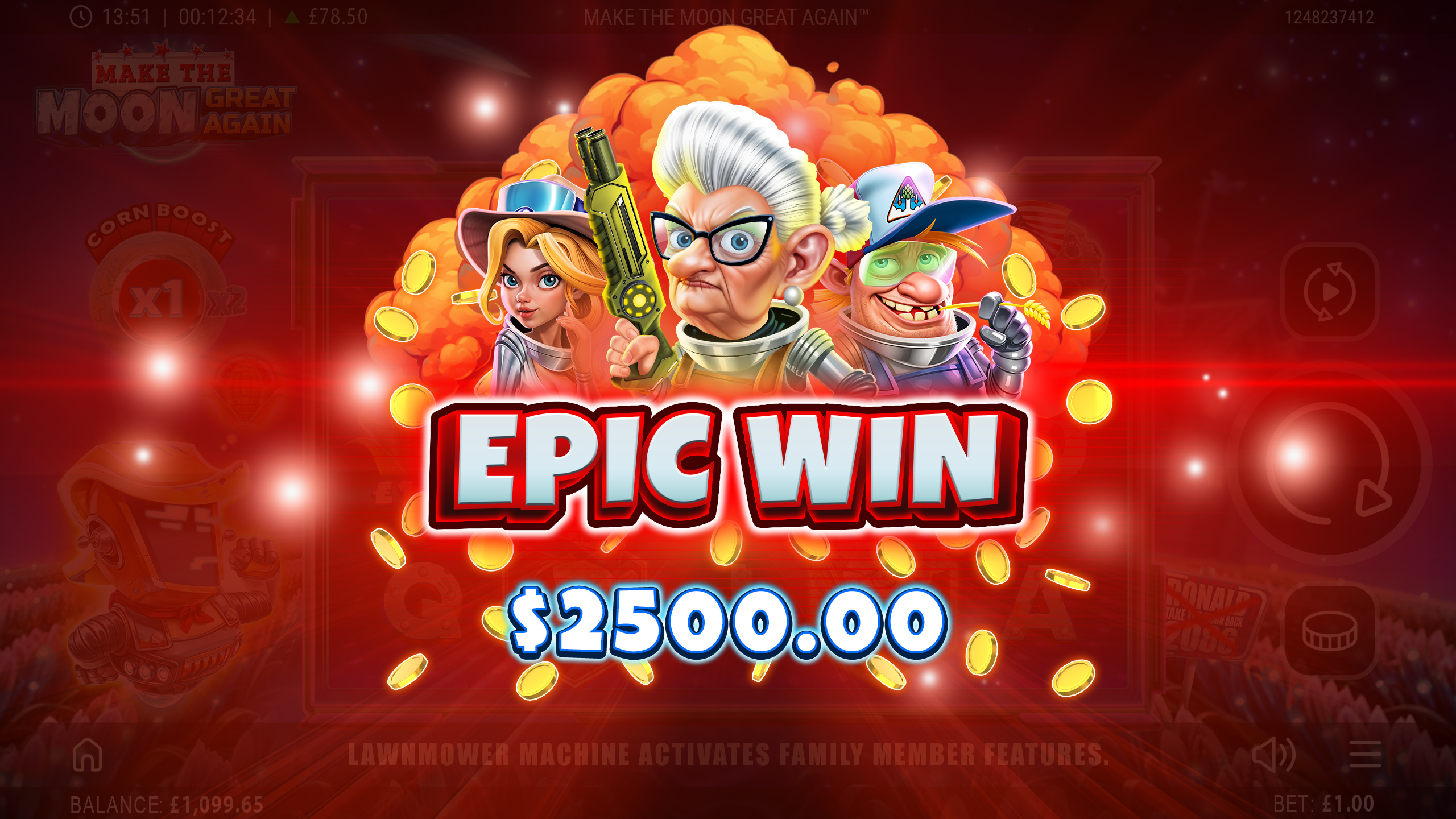 The Harvesters have fled Earth to farm Plasma Crops on the Moon, while poor Ronald the robot battles to keep his battered LawnMower from falling apart. In this offbeat 5×3 slot, the LawnMower sparks into action across the reels, transforming symbols, spawning Wilds and unleashing multipliers. When the Moon trembles, Lunar Wild Bursts scatter up to six Wilds in an instant, reshaping the grid for stellar wins. A well-timed Magnetic Mega Boost can supercharge payouts up to ×15, while Lunar Free Spins launch players into orbit with re-triggers that stack higher and higher. From rickety machines to cosmic jackpots, every spin is packed with suspense, humour and lunar-sized rewards!