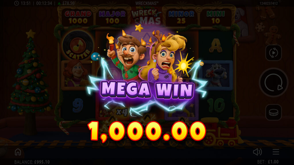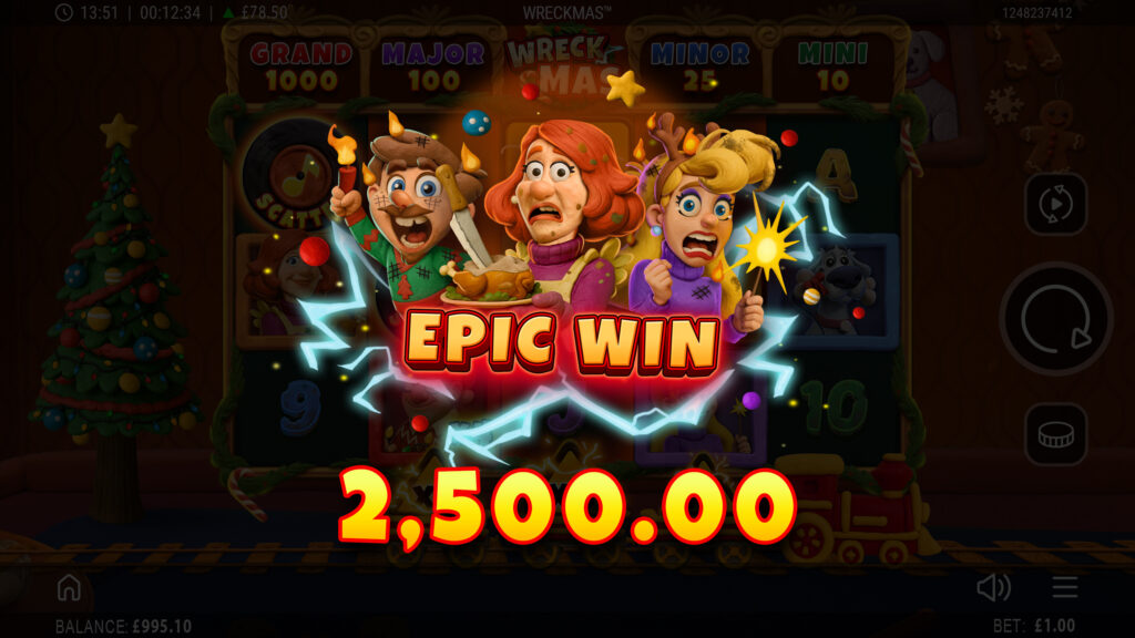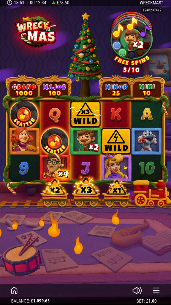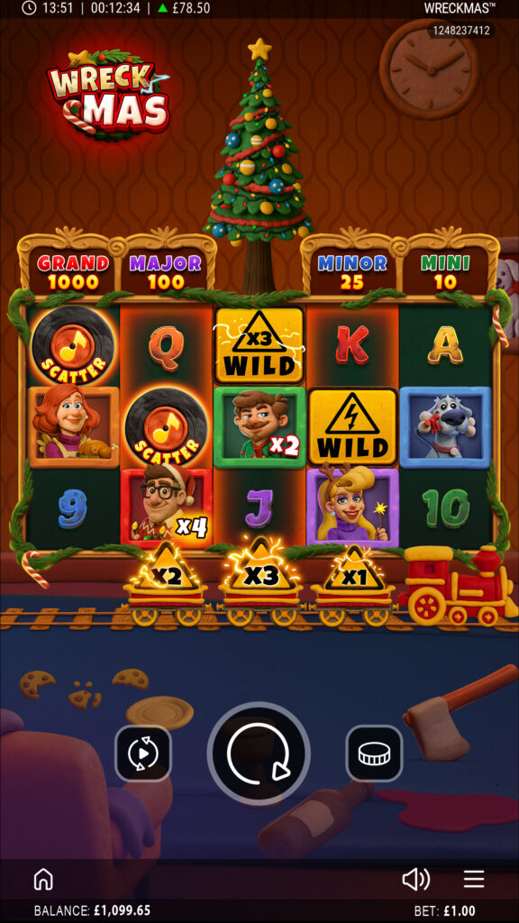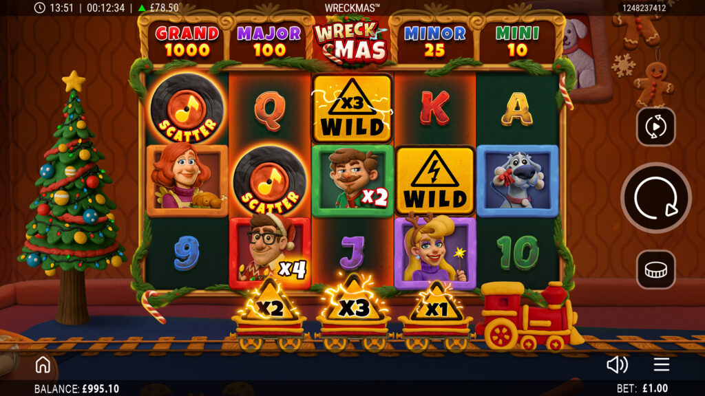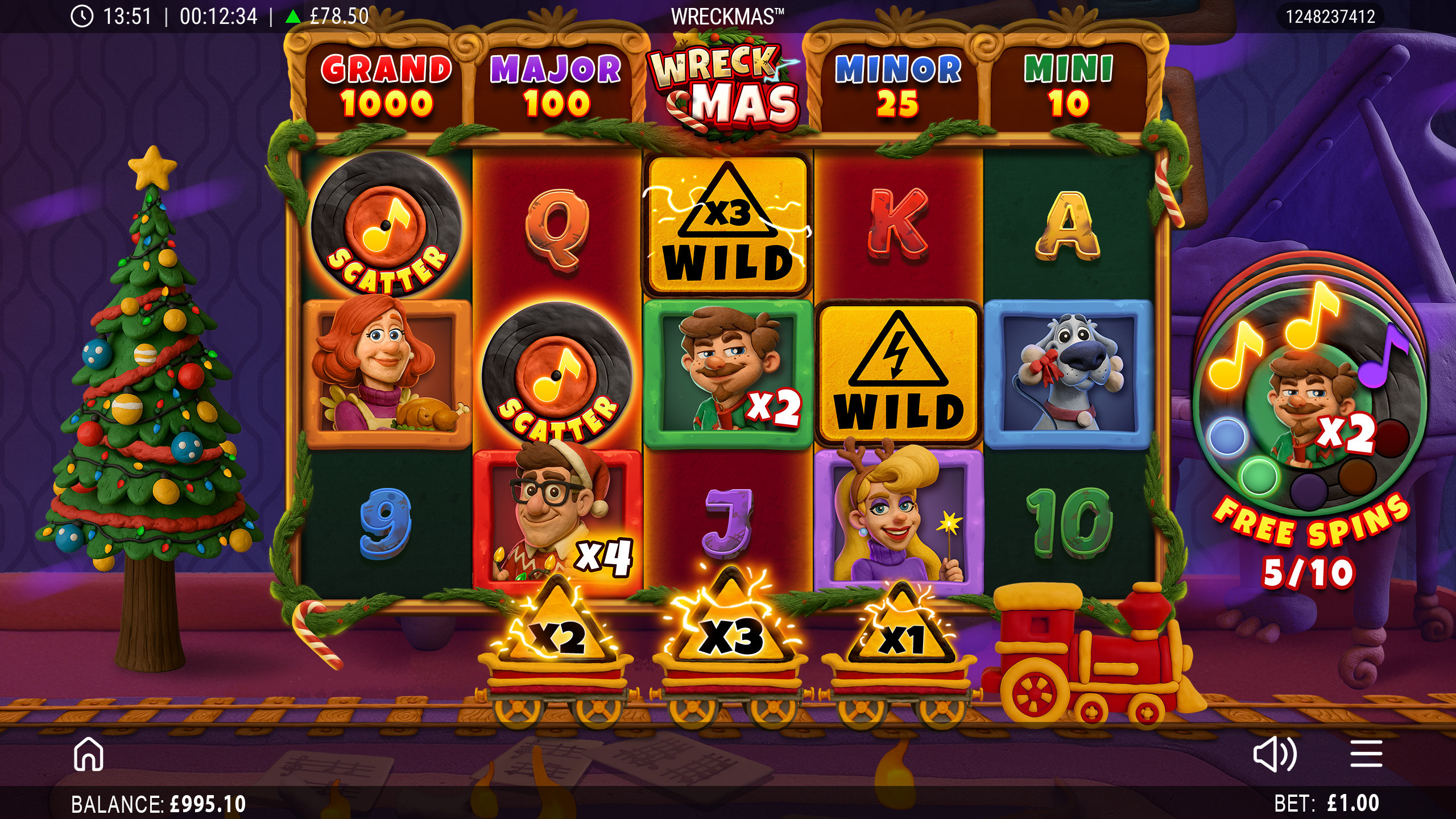 The Christmas tree is about to explode… and holiday havoc is underway! In this 5×3 slot, join a hilariously chaotic family as they turn a perfect Christmas Eve into festive mayhem. Overload the lights to trigger Wild multipliers, collect musical notes for off-key Free Spins carols, and stack Wilds in the Christmas Tree Pot Collector for a chance at festive jackpots. Watch the Wild Train roll in to boost Wilds on reels 2–4, while the Jackpot Feature lets you unwrap 15 mischievous gifts packed with Mini, Minor, Major, or Grand prizes, some even with hidden boosters. Free Spins banish low-paying symbols, upgrade high-paying ones, retrigger spins, and keep Wilds and the Pot Collector in play. With toppled trees, tangled tinsel, chaotic carols, and festive mayhem on every spin, Wreckmas turns Christmas chaos into big wins. Will you brave the holiday havoc and gather merry wins?